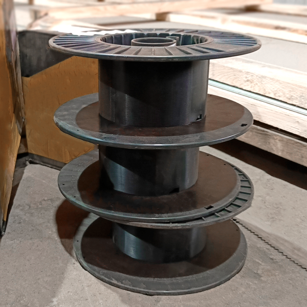 Катушка пластиковая состоит из двух барабанных половинок, среди которых вставлена втулка. Для обеспечения повышенных прочностных характеристик первые оснащены равноудаленными друг от друга ребрами жесткости, а вторые – неглубокими впадинами.